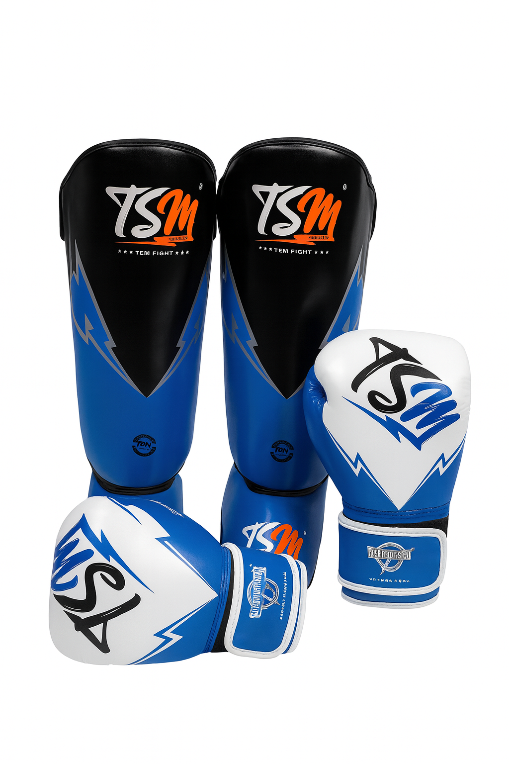 ⚡️ ست رزمی TSM شامل دستکش بوکس و ساقبند، مناسب تمرینهای بوکس، مویتای و کیکبوکسینگ است.